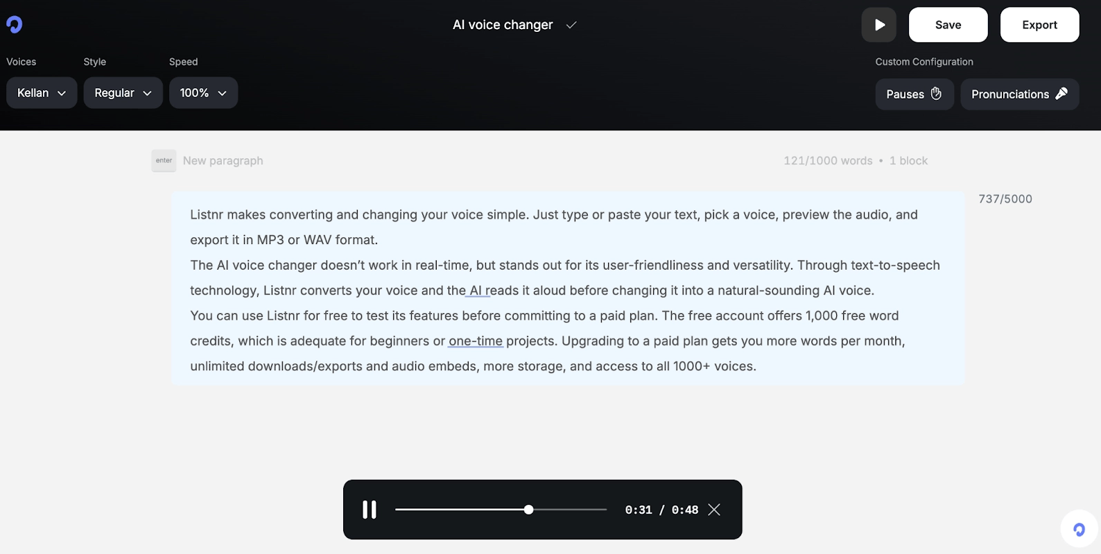 从上一部门,将来还会开辟更多的声音模式,该软件的变声手艺可以或许创制出具有腔调和感情的超逼实声音,仿佛实人。MurfAI是一款ai变声器,并将其取TTS 生成器连系利用。