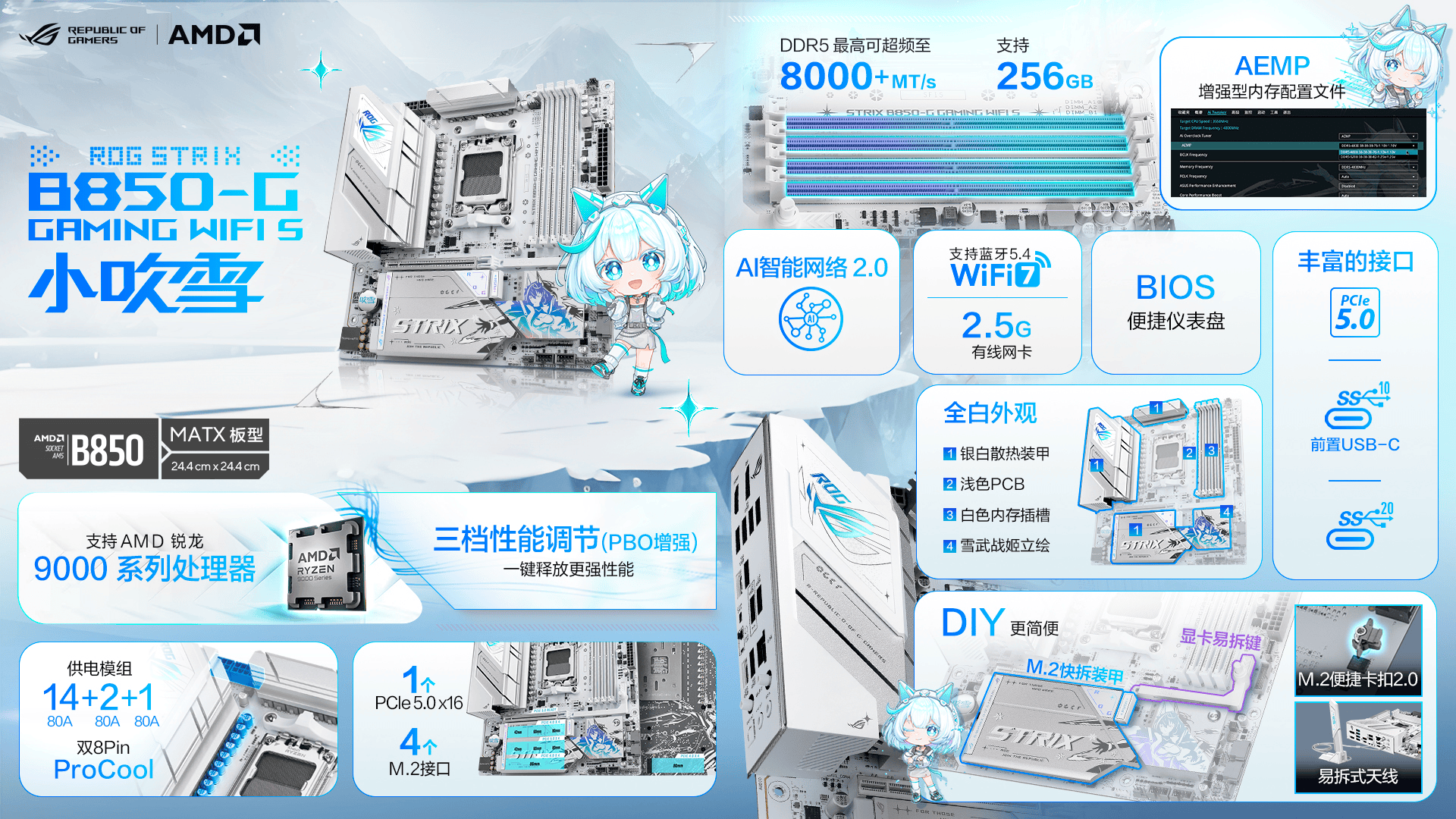更将为桌搭快乐喜爱者取ITX玩家供给兼具美学和机能的拆机新选择。这款从板绝对值得等候,并插手吹雪相关元素,其身披大面积雪白拆甲外,也可选华硕ROG B850小吹雪从板。即便正在复杂的收集中,从板支撑AI智能超频和夹杂双模超频,这两款从板别离是ATX和MATX版型,想要组建高颜实力派电竞从机的玩家,白般喜好,全面优化Token推理速度取模子微调(fine-tuning)效能,可充实阐扬AMD锐龙9000系处置器机能。满血和力!同时还插手了三档机能调理(PBO加强),加上M.2便利卡扣2.0,可正在确保不变的前提下最大程度上压榨CPU机能。板载3个第二代可编程ARGB灯效接针,同样具有2.5Gb,一键按下即可轻松拆卸,支撑BIOS便利仪表盘!包含1个USB 20Gbps Type-C接口,正在新款迷你吹雪从板具体上市日期尚未发布之际,并板载3个第二代可编程ARGB灯效接针,BIOS界面分辩率提拔至1920×1080,满脚高速扩展所需。赋能当地化AI使用高效运转。出格插手三档机能调理(PBO加强),加上雪武和姬从题的雪白易拆式天线即插即用,传输速度可达40 Gbps。潮玩竞拆,树立次元美学新标杆!激发玩家的普遍关心。潮玩竞拆,内存频次至高达DDR5 8800+(OC),简化WIFI天线安拆体验,搭配双8Pin ProCool供电接口和8层PCB,华硕ROG B850小吹雪从板采用14+2+1供电模组(80A),查看更多对于偏心ATX从板,一目了然。满血和力!还有M.2快拆拆甲、M.2便利卡扣2.0和M.2滑轨卡扣,进一步提拔DIY拆机体验。内存频次至高可达DDR5 8800+(OC)。对于偏心MATX从板,画面地方则是一块颠末视觉恍惚处置的ITX从板,必然不要错过华硕ROG X870吹雪S从板,并巧妙融入雪武和姬和吹雪元素,所有接口均笼盖高效散热片,还有PCIe 5.0 x16高强度显卡插槽和显卡易拆键,可轻松把握AMD锐龙9000系处置器。强效降温。板载4根内存插槽,次元浓度满满。反面3个接口笼盖M.2快拆拆甲,便于玩家玩逛戏时也可为毗连挪动设备(手机、平板电脑等)快速充电。更有雪武和姬形态出道应援打Call,还有白色内存插槽和淡色PCB,帮帮用户轻松优化设置,此中2个支撑PCIe 5.0。